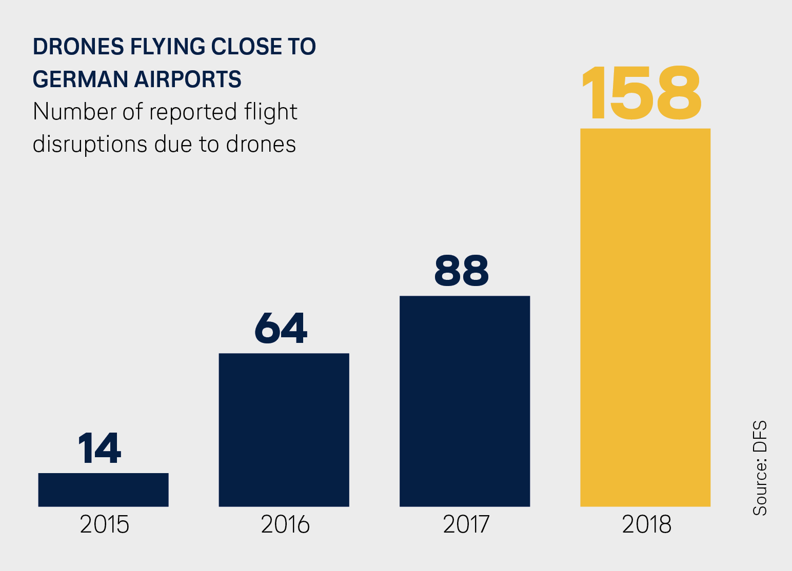 Almost 500,000 drones are currently being flown in Germany, and the tendency is increasing sharply. Of these, around 5 percent are used for commercial purposes. Completely new areas of the service sector are being created – with positive effects on new jobs and prosperity. However, drones are more and more frequently being sighted in the areas directly surrounding airports. This brings an increased danger that drones may collide with aircraft or impair flight operations. The boom is therefore throwing up some important questions in terms of security policy. ...more