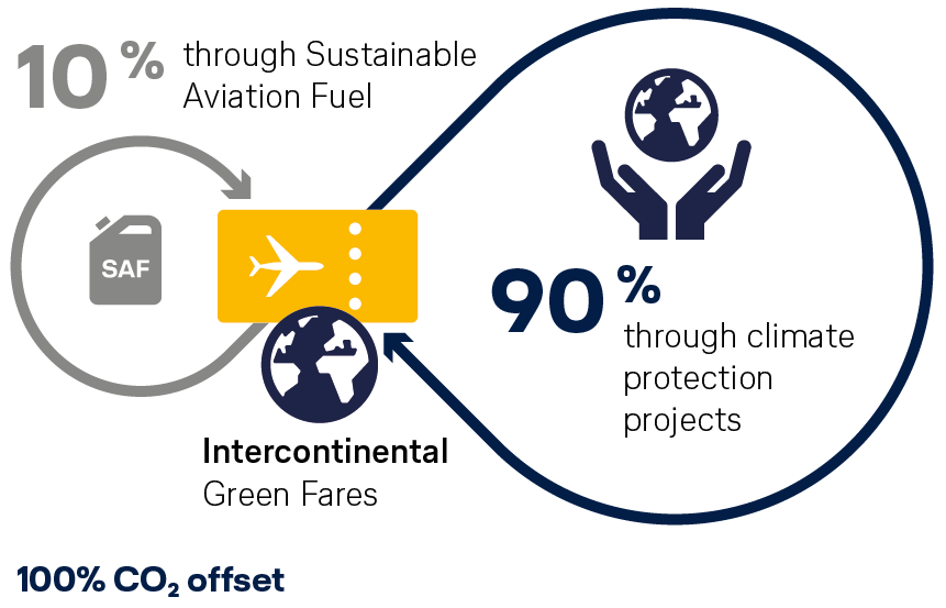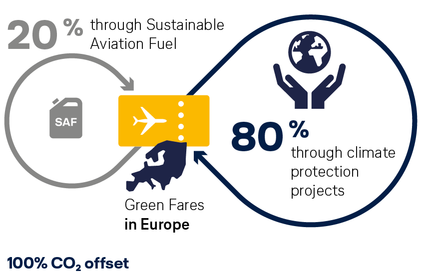 - CO2 compensation: With the “Green Fare Tickets”, the Lufthansa Group offers its passengers a fare in which individual flight-related CO2 emissions are compensated. Throughout Europe, 20 percent of the CO2 emissions are offset by using SAF and 80 percent through a contribution to high-quality climate protection projects. On intercontinental routes, 10 percent of flight-related CO2 emissions are reduced by using SAF, while the remaining 90 percent are offset via climate protection projects. In the first year since their introduction, an average of three percent of passengers have opted for these more sustainable fares, and the trend is rising.