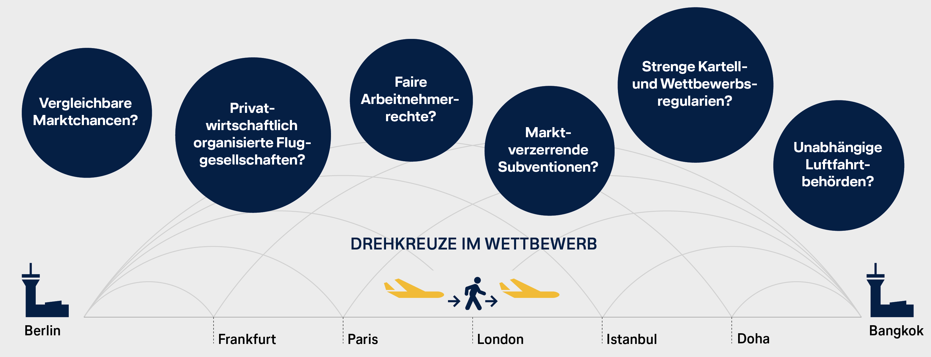 Der deutsche Luftverkehrsmarkt zählt laut Studie der OECD zu den liberalsten weltweit. Rund 160 Fluggesellschaften von allen Kontinenten steuern heimische Flughäfen an. Grundlage dafür sind der EU-Binnenmarkt und Luftverkehrsabkommen, die von dem Bundesverkehrsministerium oder der EU-Kommission verhandelt wurden. Diese völkerrechtlich verbindlichen Verträge sichern seit Jahrzehnten weltweit die stetig steigende Verbindungsvielfalt – und sind für fairen Wettbewerb unersetzlich. ...weiter