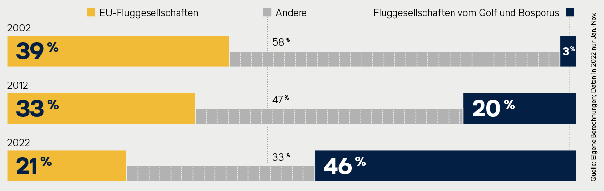 | | | | Die Ankündigung aus Saudi-Arabien Ende 2022 ließ aufhorchen: Eine weitere Airline und ein neuer Flughafen entstehen. Die Kapazität in Riad soll bis 2050 auf 185 Millionen Passagiere steigen. Das Investitionsvolumen beträgt 100 Milliarden US Dollar. Zum Vergleich: Im Rekordjahr 2019 zählte der Frankfurter Flughafen nicht einmal halb so viele Reisende. Auch in Istanbul stehen die Zeichen auf Expansion: Der dortige Flughafen ist Heimat von Turkish Airlines. Bei seiner Öffnung im Jahr 2018 lag die Kapazität bei 90 Millionen Passagieren. Bereits 2027 soll die Abfertigung von bis zu 200 Millionen Passagieren möglich sein. Hinzu kommen die Vereinigten Arabischen Emirate und Katar mit ihren riesigen Drehkreuzen. Die staatliche Infrastruktur ist hochmodern und erlaubt unbegrenztes Wachstum – in Europa unvorstellbar. Diese Staaten subventionieren ihre Home-Carrier bereits seit Jahren, das finanzielle Ausmaß bleibt intransparent. Nur so können Emirates und Qatar Airways auch mutmaßlich unwirtschaftliche Strecken bedienen. Marktanteile verschieben sich zulasten der EU Die kompromisslosen Investitionen am Golf und Bosporus haben unmittelbare Folgen für die EU. Für heimische Netzwerk-Airlines und ihre Drehkreuze hat sich der Wettbewerbsrahmen stetig verschlechtert. Der Blick auf den EU-Asien-Verkehr bestätigt: Die Verkehrsströme verlagern sich zunehmend aus der EU heraus. Im Jahr 2002 hielten Airlines vom Golf und Bosporus einen Marktanteil von 3 Prozent. Im vergangenen Jahr lag er bereits bei 46 Prozent. Eine Trendumkehr ist nicht in Sicht. Im Gegenteil: Der regulatorische Rahmen begünstigt diese Entwicklung. Die geplante EU-Klimaschutzpolitik (Fit for 55) behandelt die Erwartung europäischer Netzwerk-Airlines zugunsten eines Level-Playing-Field stiefmütterlich. Folglich profitiert die Konkurrenz sogar noch von asymmetrischen Umwelt-, Verbraucherschutz- und Sozialstandards „made in Europe“. | |